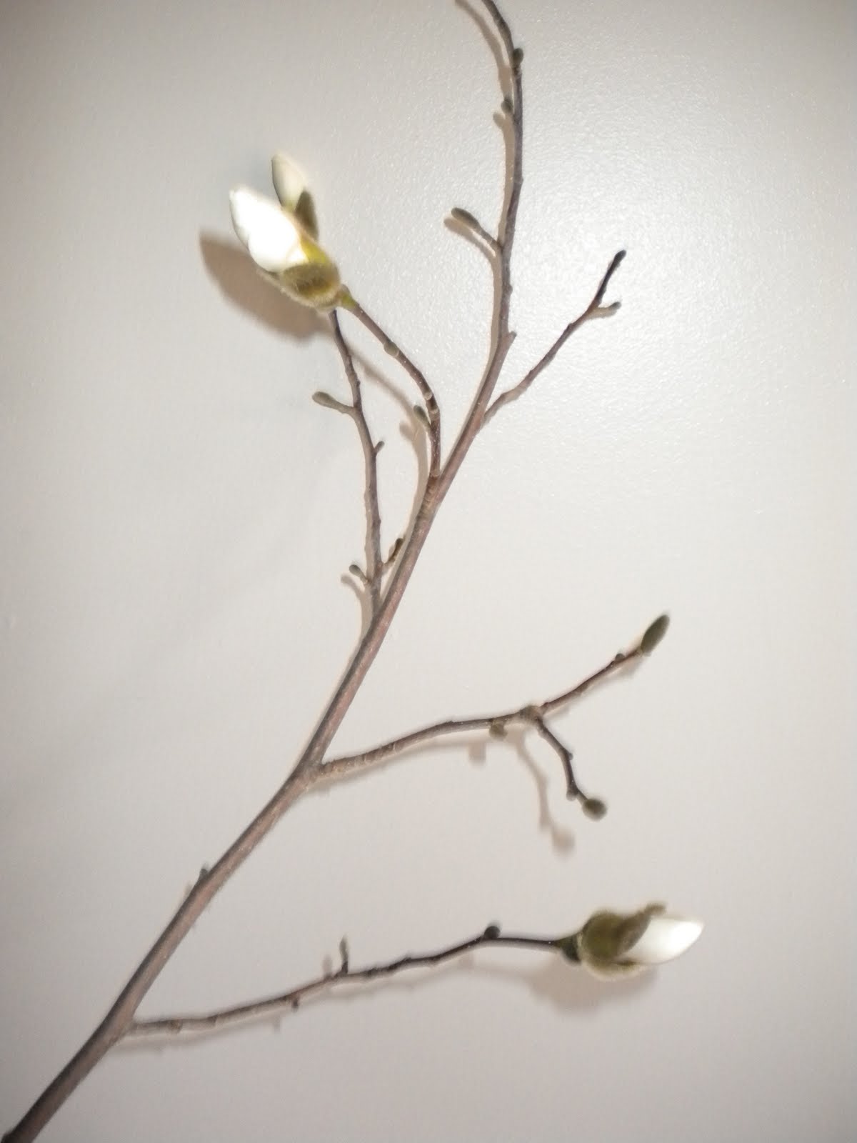 After many great days of warm weather and the garden beginning to peek through – it has turned cold and gray again today. But Amy has a solution to keep spring alive. She noticed that a branch of her magnolia tree was half broken when she was out on one of the warm days. And no, I did not do it. The tree is out front and I am not allowed out there much since there is traffic. Anyway, she brought the branch in and stuck it in water and now the flowers are beginning to emerge. It is slow but will look great once they bloom. I posted a pic so you can see how far along they are – hopefully it will bloom for Easter – that would make Amy very happy.