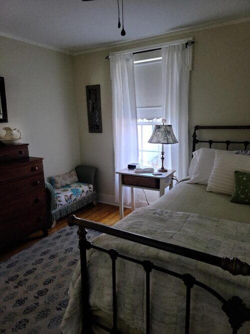 Enter our Garden Suite, located on the second floor, through the private sitting room. Here you can escape from your travels, write a postcard or enjoy a glass of wine. The sitting room allows for additional sleeping space on the pull out queen sofa bed. Walk through to the bedroom where you will enjoy a restful night’s sleep in the comfortable queen size bed. Revive yourself in the private bath which features an easy step in shower, soft towels, premium personal care products and a hair dryer. There are two great views; the bedroom overlooks our garden and patio while the sitting room overlooks the side and front gardens. The suite’s garden theme décor brings the garden inside all year round.